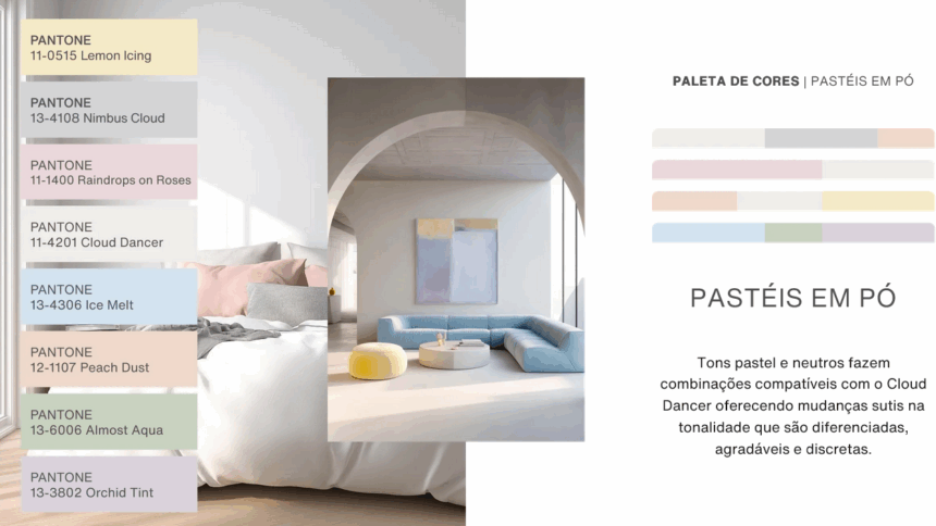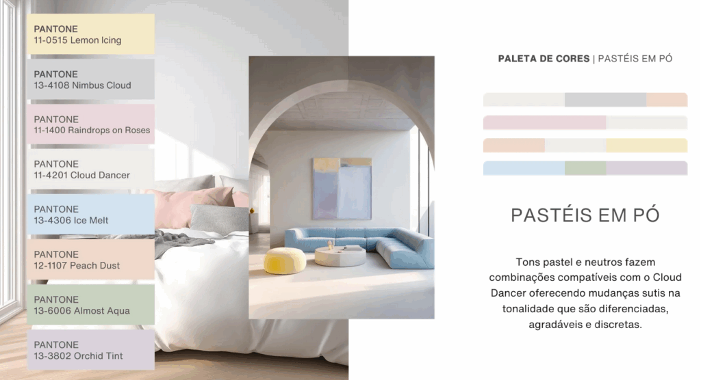 Como sempre, a Pantone não apresenta a Cloud Dancer de forma isolada, mas como a protagonista de um conjunto harmônico. As combinações oficiais propostas pelo instituto abrem um leque de aplicações, da mais serena à mais contrastante. Abaixo, as paletas-guia que definem como esta cor dançará ao lado de outras em 2026: