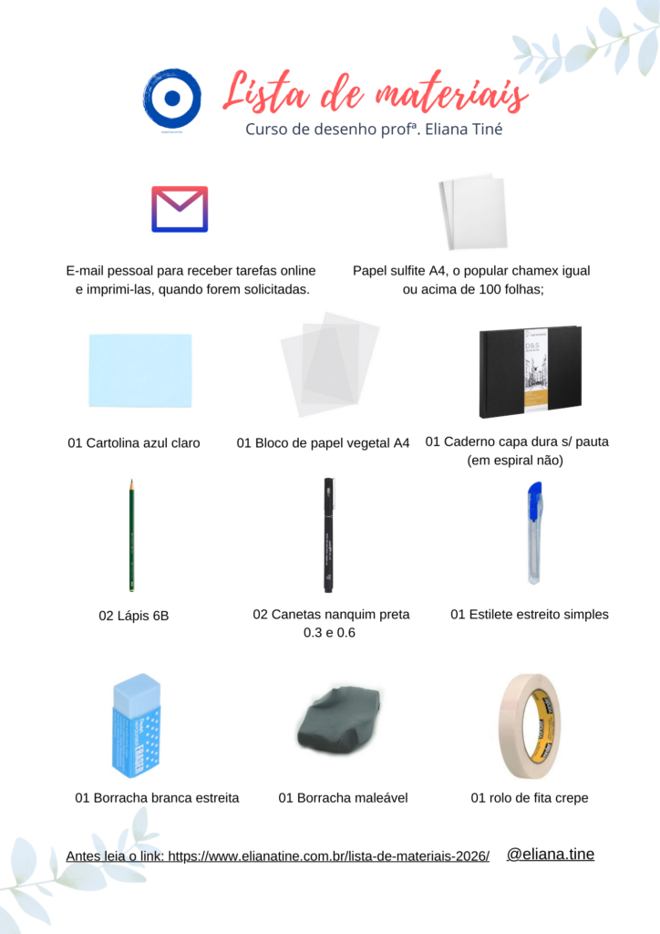 A proposta pedagógica valoriza escolhas conscientes. Por isso, a lista de materiais é pensada com foco no melhor custo-benefício, apoiando o desenvolvimento técnico e sensível ao longo do curso.